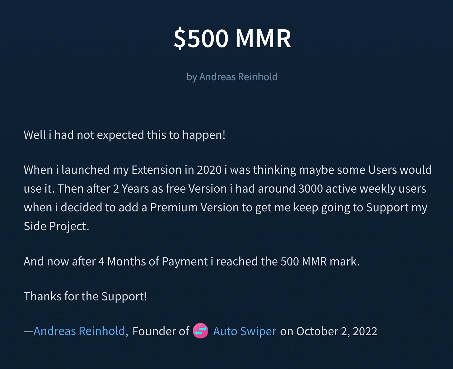 Andreas reached $500 MRR with his chrome extension Auto Swiper